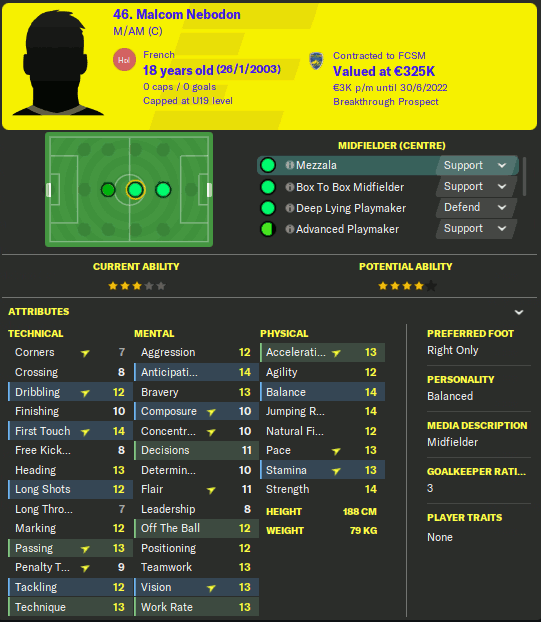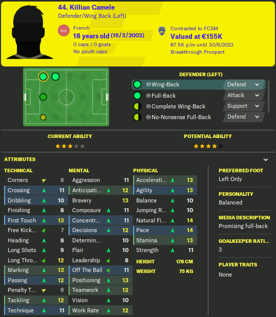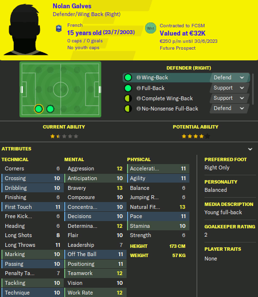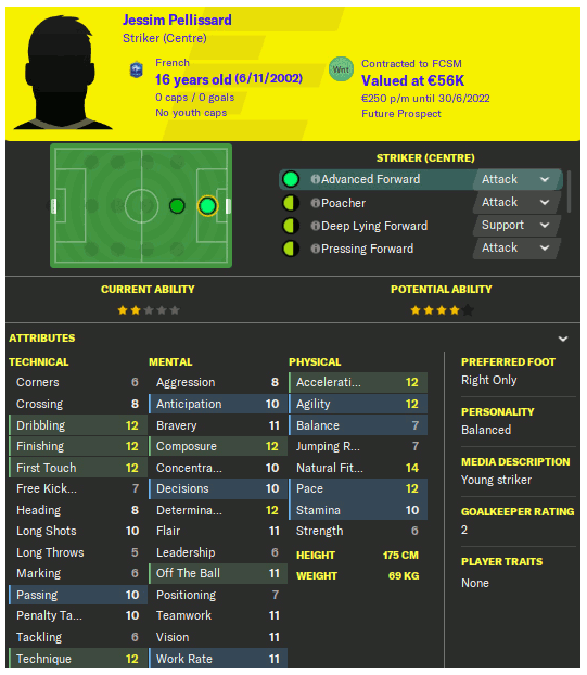 Jessim Pellissard is a striker, and I believe the 16-year-old could become a deadly one. Again, we have a player with a lovely attribute spread. He does need to improve his stamina from the go if he wants to play for the first-team at a young age. His balance is a point of attention too.