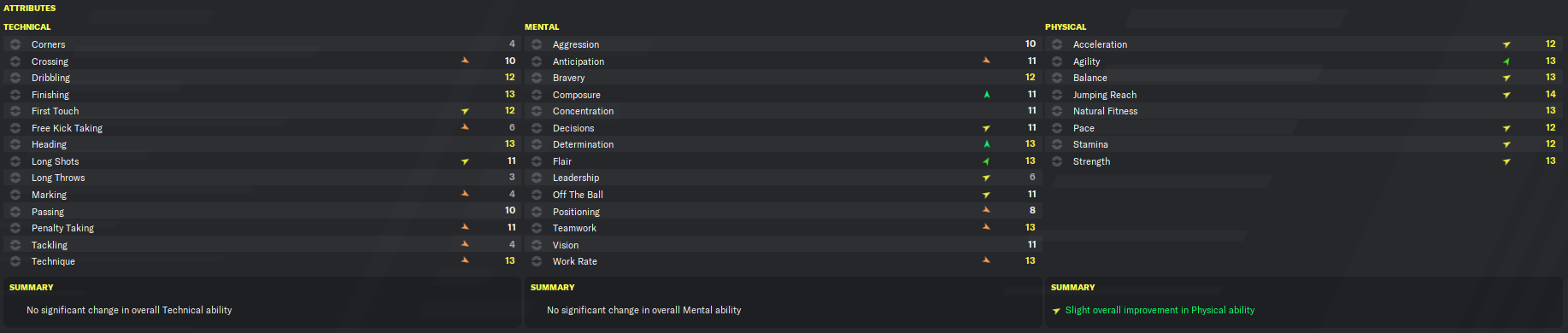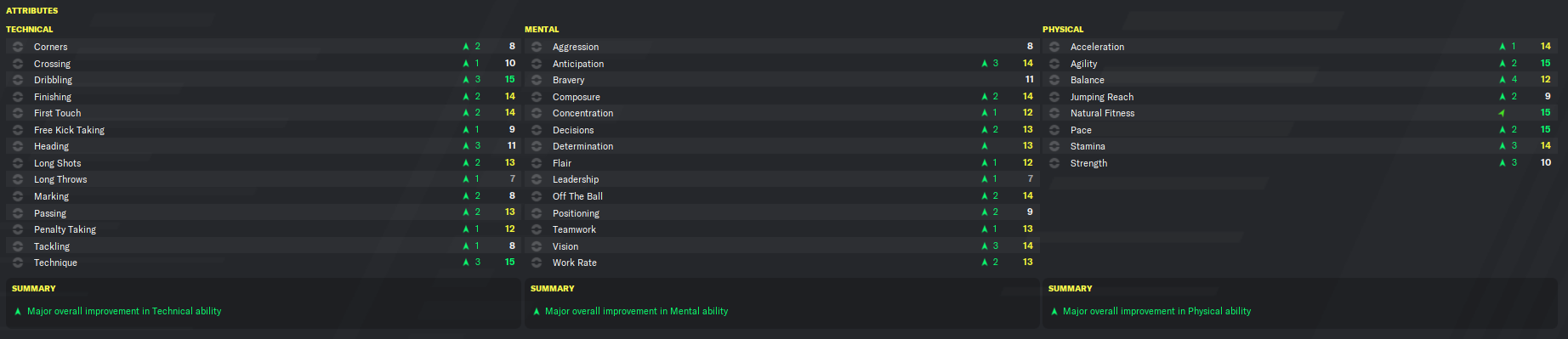 He has improved his attributes quite a lot since the start of the save. I’m not going to name them all as images say more than a thousand words, but here’s a little summary:
