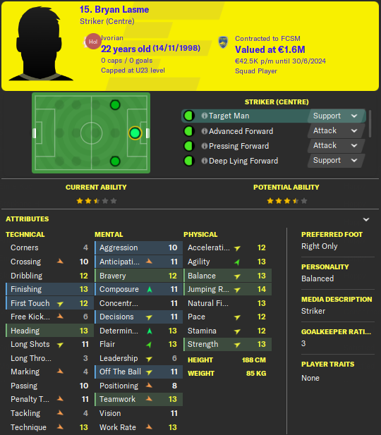 Lasme played 31 games during last season, ending up being our top scorer with 12 goals. He has played another 19 games this season, scoring two goals in Ligue 1. It should be enough to progress a bit, and he did by the end of the first season but have fallen back in development this year. 18-year-old Pellissard has taken over his job by now, and I lost my trust in him completely. I’m still debating about keeping him for another season or not..