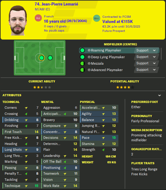 16-year old Jean-Pierre Lemarié (what a name!) is the first newgen on this list who came through our first youth intake. This guy is going to get far and has already attracted interest from PSG! He made his debut in Ligue 1 and will feature in the first team next year. I’m not sure about what role he should play yet, but whatever it is going to be, this kid is going to get really good!