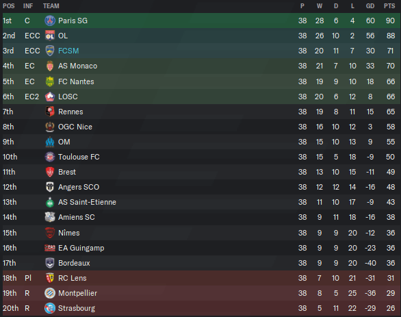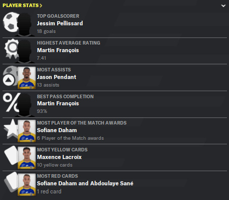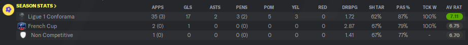I was a bit scared about him being too good for the B-team but not yet ready to be in the first team. I tried to loan him to other clubs, but as aforementioned, there wasn’t any interest. He could’ve easily been in Skelly Alvero’s shoes! Fortunately, I dared to test my luck, and he didn’t disappoint. Pellissard played 38 games in Ligue 1 this season, scoring 17 goals, winning five Player of the Match awards and averaging a 7.11 rating. Keep in mind that the kid is still only 18 years old, and we’re a team that got promoted last year. A true revelation!