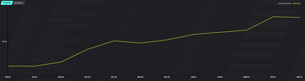 If you’ve read my earlier posts, then you know what’s coming next; progression! Pellissard has been training the advanced forward role for two years now. I’ve changed his additional focus throughout the seasons, but he’s been working on agility and balance, attacking movement, final third and passing. He exploded at the start of the season because he was playing in Ligue 1 which is a very high level compared to his ability back then. He kept improving gradually as the season went on with another spike in March.