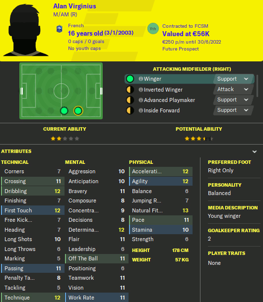 His technical ability is already good enough to play for us. Dribbling, finishing, first touch and technique are all at 12 already! There are no real weaknesses in his mental attributes although, he needs to become more mature overall.