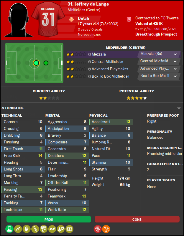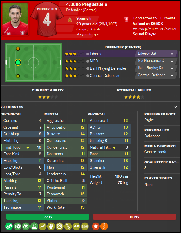We do not have an awful lot of central defenders at Twente. Kik Pierie, who’s on loan from Ajax, 28-year old Dumic and Pleguezuelo are the ones fighting for a first XI spot. Then we have 16-year old Michel Driezen, who could go far, as a back-up. I believe that Driezen can grow into a first-team regular, but as you can see, he has lots of work to do! Driezen has all the attributes in the right places but needs to grow overall. We can not expect him to be ready next season and take over from Pierie, who will return to Ajax after the first season.