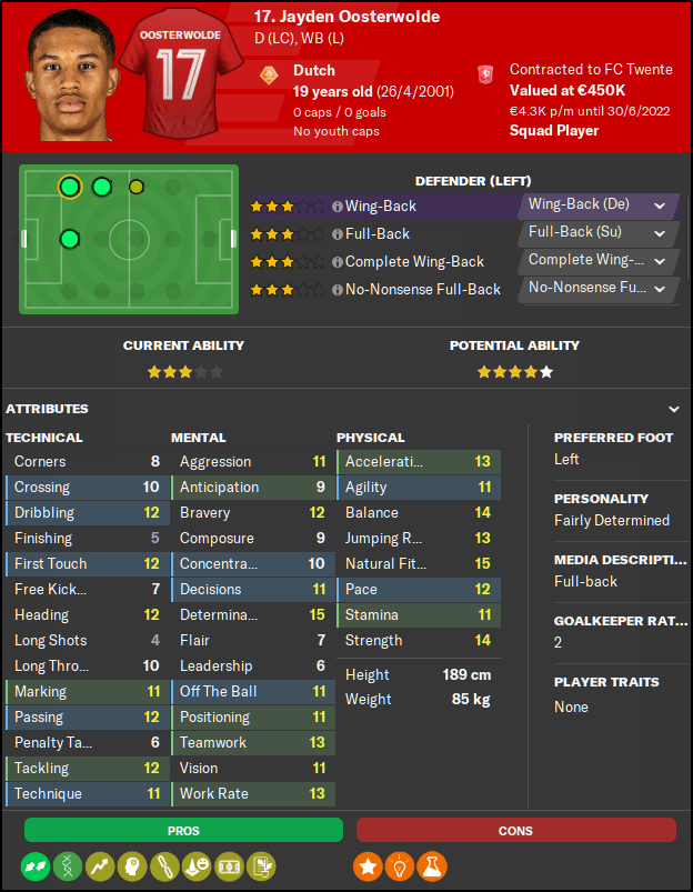 I know, this might get a bit monotonous but there is one last player I want to show you! This guy is one of my favourites and he will be a starter from day one. 19-year old Jayden Oosterwolde will be our main left-back, and I expect him to grow rapidly. He already has what it takes to be a regular starter in Enschede and only needs to focus on becoming even better. This guy has the potential to become a star player for FC Twente, so I will monitor him closely!
