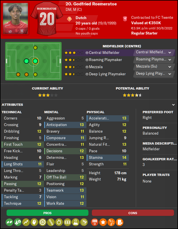 Next in line is 20-year old Godfried Roemeratoe (love that name), who is much closer to breaking into the first team and more well-rounded as well. But, he must improve his tackling significantly if we want him to be a Deep Lying Playmaker. He will get plenty of game time in the first season, so I am curious to see where his development will go!