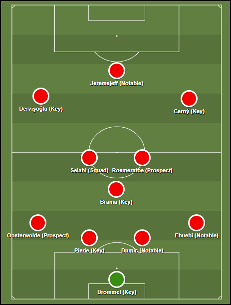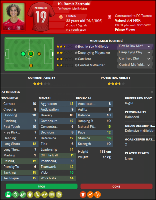 Last but not least, we have got Zerrouki. The 22-year old offers quite a challenge. He could be the heir to Wout Brama with his excellent vision, technique and work rate. However, he lacks first touch, decisions, anticipation and balance. I don’t know how much more we can get out of him, but if we do, I want him to grow in these attributes.