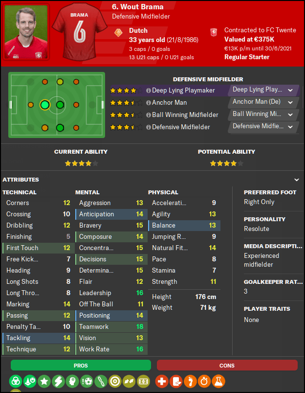 Drommel is only 23-years old and has still some room to improve. The goalkeeper is an academy product and with the club since 2014. I like to keep him at Twente for his entire career. He has been called up for the national team for the first time in real life recently, which is something I would like to see happening in my savegame as well.