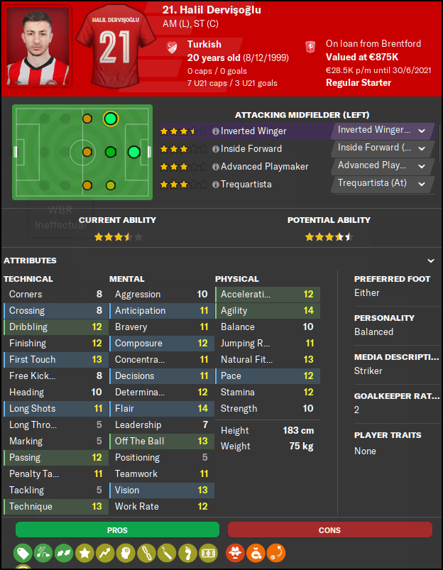 Next in line is Halil Dervişoğlu who is another loanee in the squad. Still, he will be one of the key players in our team. The 20-year old Turk could play either on the left-wing or as a striker, and I am not sure where to play him yet. I like his flair and two-footedness, which makes him an unpredictable player.