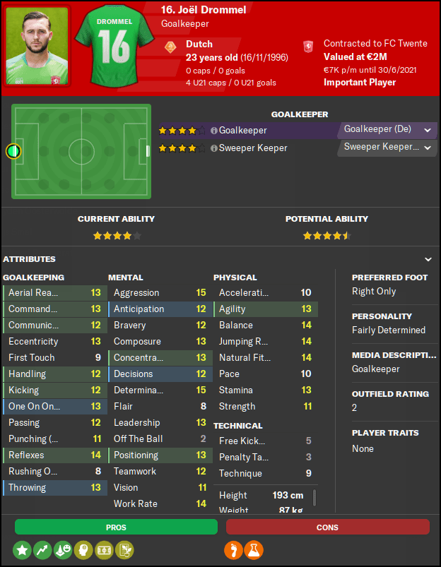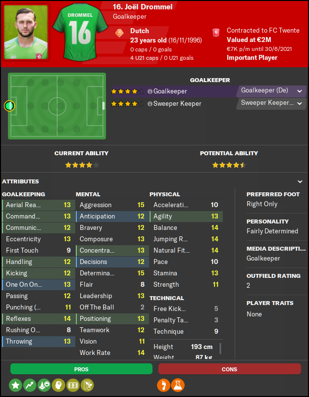 FM suggests Drommel is capable of playing as a Sweeper Keeper, but I think he is more like a shot-stopper. His first touch, rushing out and acceleration are not good enough to be a Sweeper Keeper in my opinion. He will be our main goalkeeper and I will focus his development towards his mental attributes.