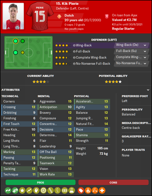 I do not want to make this list too long, so here is the last one: Kik Pierie. Pierie is a very promising player on loan from Ajax. The 20-year old can play as a left-back or central defender, but I think I will deploy him as a Ball Playing Defender.