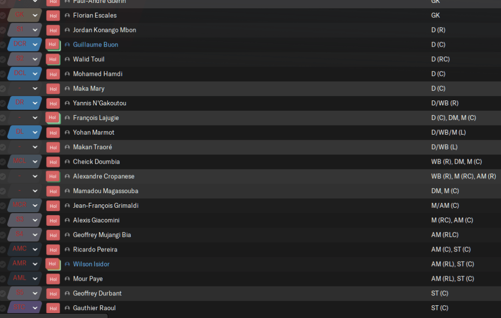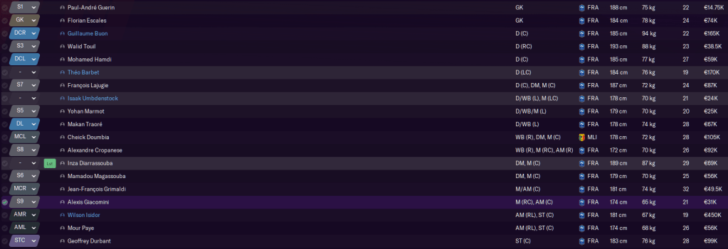 After meeting with everybody and watching all the videos, it was clear to Andrea that this squad was better than he expected. Almost every position was taking by somebody who is capable to play in the 3rd division of France. The only thing missing in the squad is a right full back. As one of the objectives the board has put that he needs to work within the wage budget. At the moment the wage bill is a little bit above the limit. Because of this, the loans of Barbet and Umbdenstock will be terminated at the earliest opportunity. Diarrassouba is played on the transferlist because he isn’t in the plans of the new manager.